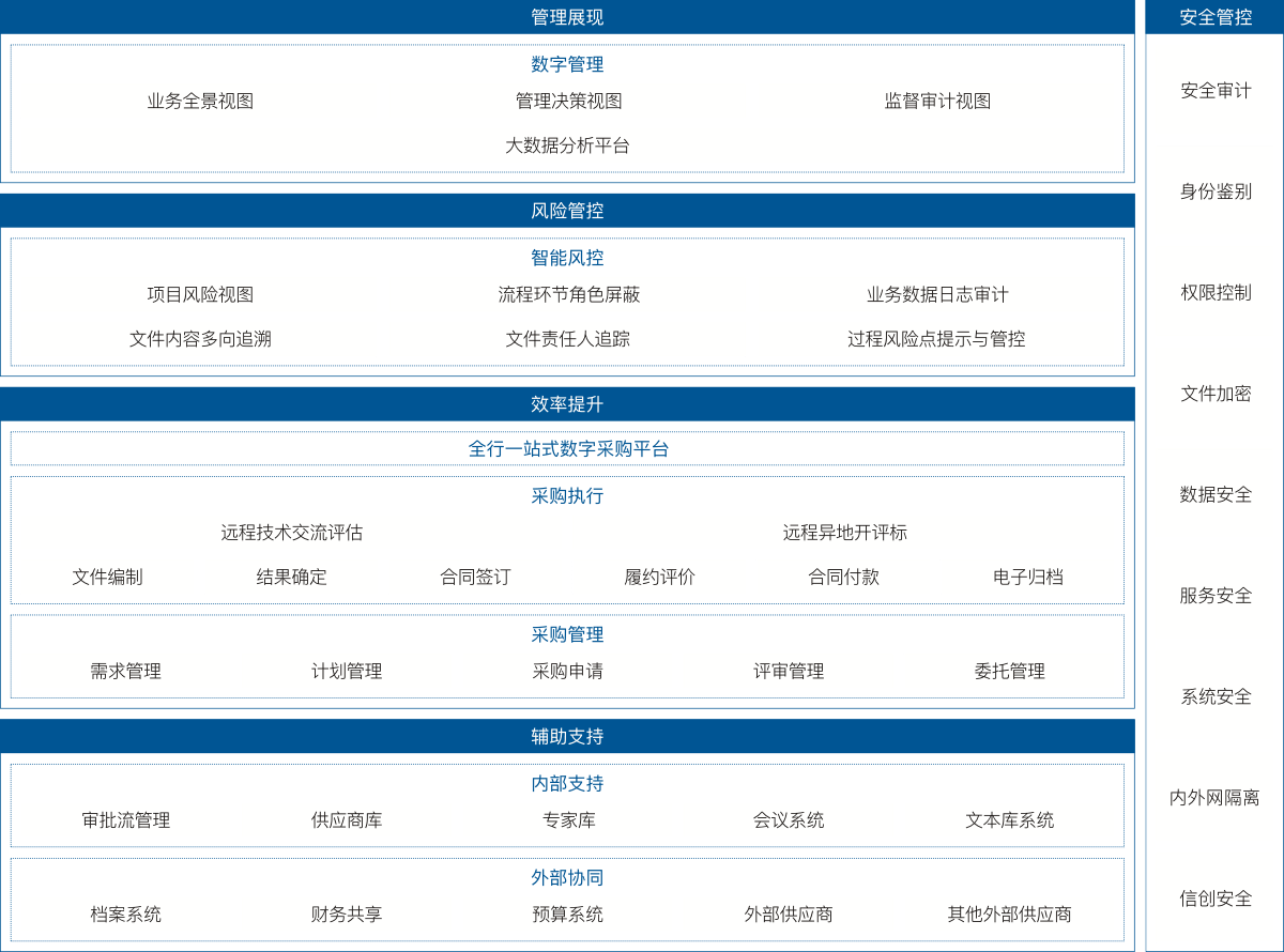 金融招采平臺是公司結合眾多金融行業(yè)采購特點,采用流程優(yōu)化再造的理念,為銀行、保險、證券、交易所、基金等金融機構打造的細分行業(yè)產(chǎn)品,助力金融行業(yè)采購合規(guī)管控、風險防范、成本管理和效率提升。系統(tǒng)由采購預算、采購需求、采購過程管理、合同管理、電子開評標、網(wǎng)上商城等構成,可實現(xiàn)金融行業(yè)采購需求與管控全過程、全流程的電子化,為采購需求方、采購執(zhí)行人、投標人、專家、監(jiān)管機構提供一個一體化的操作執(zhí)行、監(jiān)督管理與決策支持平臺。