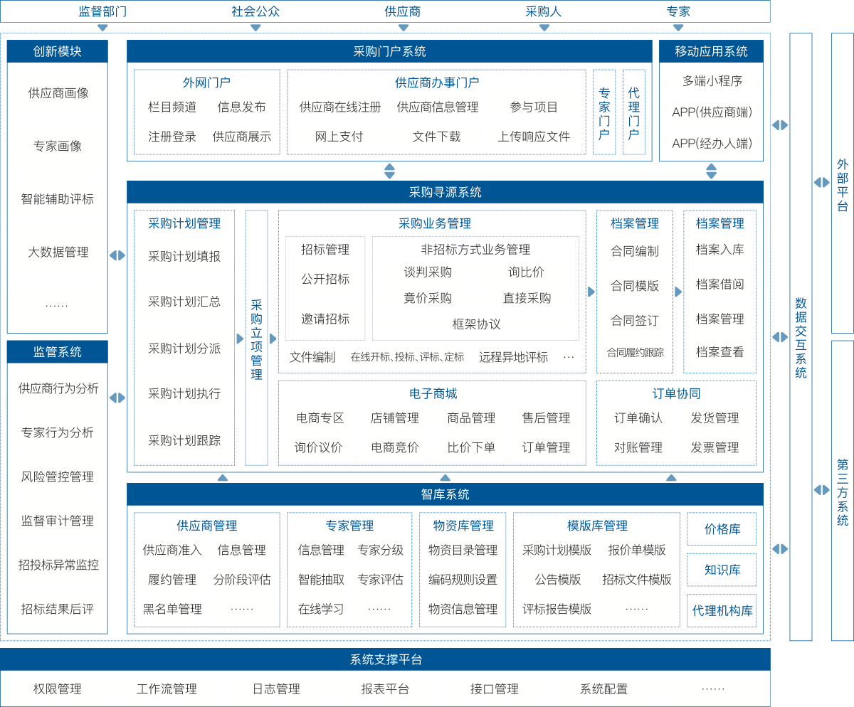 企業(yè)電子化招標(biāo)采購系統(tǒng)是公司在眾多企業(yè)采購需求分析與實操經(jīng)驗的基礎(chǔ)上,融合供應(yīng)鏈上下游相關(guān)業(yè)務(wù),為央企、國企、民企等用戶開發(fā)的覆蓋全業(yè)務(wù)類型、全采購流程、全采購方式的一體化招標(biāo)采購平臺。對于招標(biāo)項目提供交易過程的全流程電子化、規(guī)范化管理;對于非招標(biāo)項目提供詢比價、網(wǎng)上競價、拍賣、框架協(xié)議等模式,方便需求單位快速、高效采購;對于供應(yīng)商,提供從入庫、績效管理到凍結(jié)退庫完整的生命周期管理;對于訂單協(xié)同提供訂單簽訂、執(zhí)行、對賬、付款的閉環(huán)管控。為采購各方提供一個一體化的操作平臺,實現(xiàn)企業(yè)采購工作的信息化和規(guī)范化。