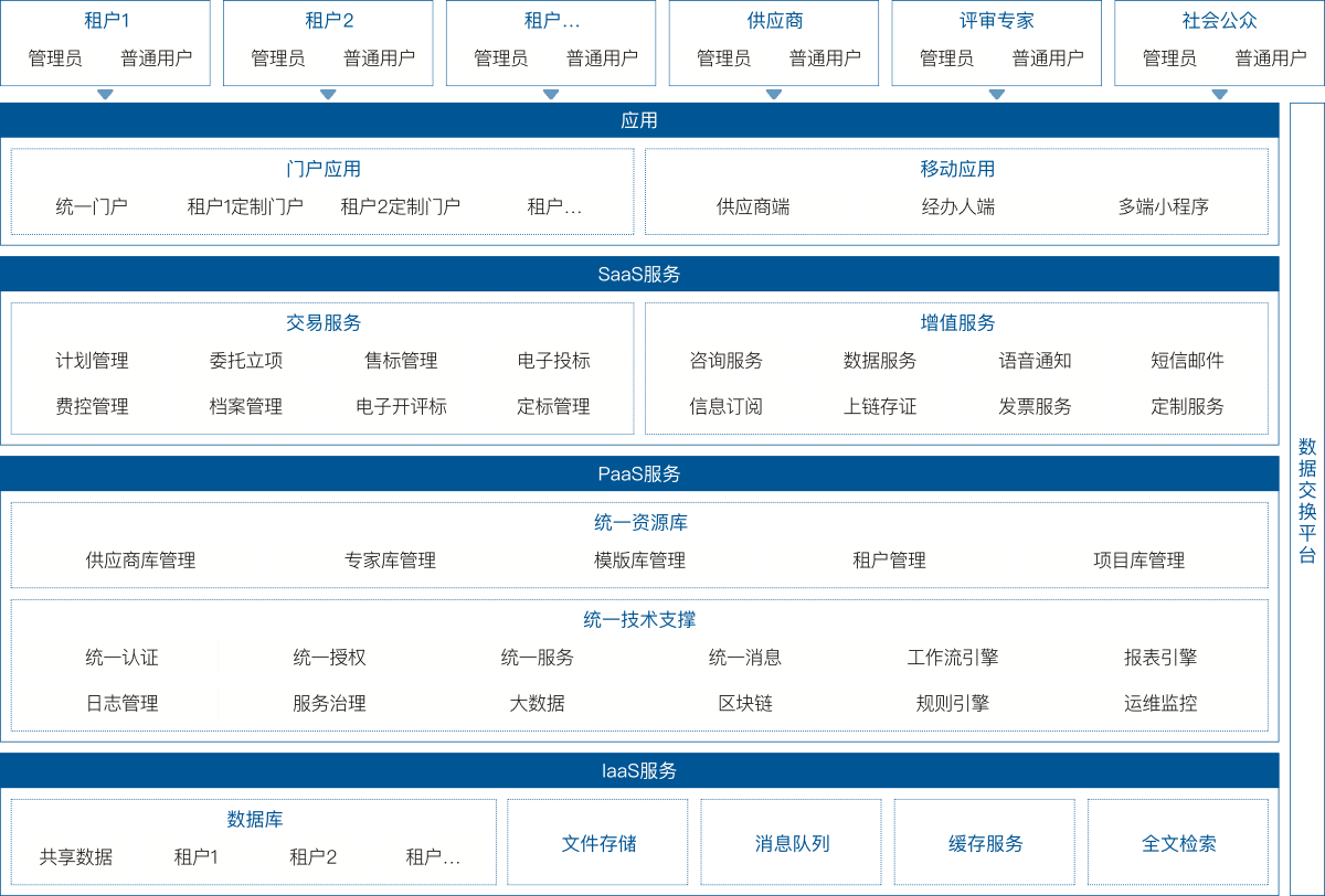第三方交易運營平臺是公司著力打造以交易運營服務為基礎的電子招投標平臺。客戶通過該平臺可為租戶提供采購交易、信息訂閱、增值服務、供應鏈金融、業(yè)務咨詢等服務。